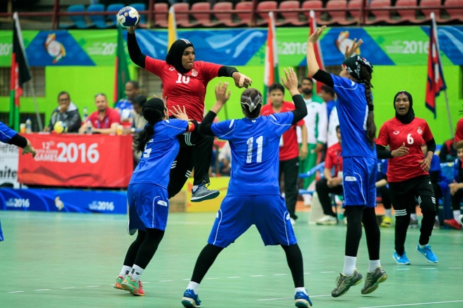 ސައުތު އޭޝިއަން ގޭމްސްގައި އަފުޣާނިސްތާންގެ މައްޗަށް 48-13 ގެ ތަފާތު ބޮޑު ނަތީޖާއަކުން ކާމިޔާބު ހޯދައި ގައުމީ އަންހެން ހޭންޑްބޯލް ޓީމު މުބާރާތުގެ ސެމީ ފައިނަލްގެ ޖާގައެއް ހޯދުމާ ގާތަށް ޖެހިލައިފިއެވެ.