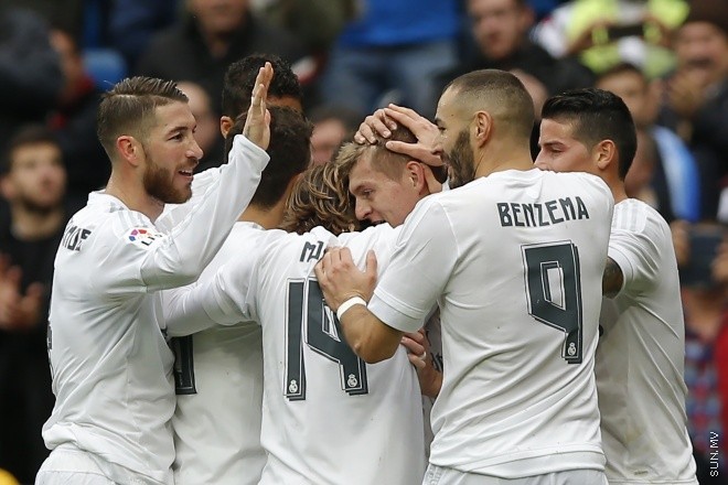 ސްޕެނިޝް ލަލީގާގައި ރެއާލް މެޑްރިޑާއި އެތުލެޓިކޯ ބިލްބާއޯ ކުޅުނު މެޗުގައި ޓޯނީ ކްރޫސްގެ ގޯލަށް ފައު ރެއާލްގެ ކުޅުންތެރިން އުފާފާޅު ކުރަނީ --- ފޮޓޯ: އޭޕީ