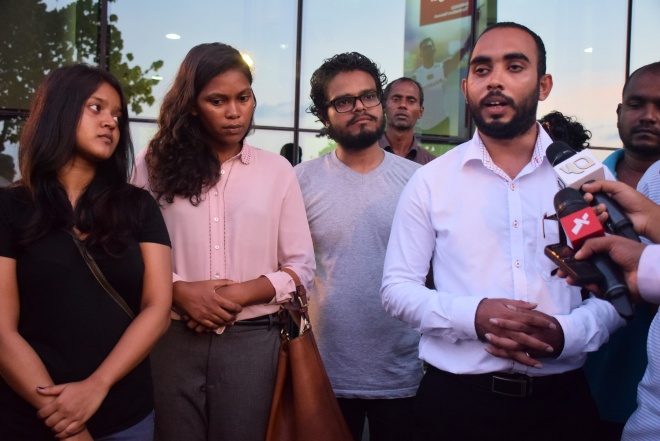 3 މާރިޗު ވަނަ ދުވަހު ނޫސްވެރިން ބޭއްވި މުޒާހަރާގައި ހައްޔަރުކުރި ބައެއް ނޫސްވެރިން މީޑިއާއަށް މައުލޫމާތު ދެނީ -- ސަން ފޮޓޯ/މާހިލް މުހައްމަދު