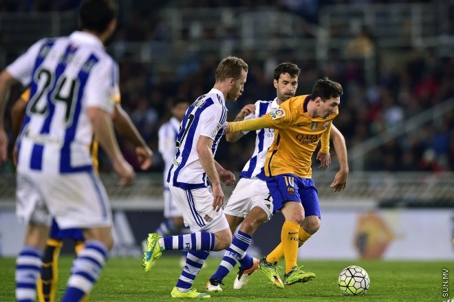 ސްޕެނިޝް ލީގްގައި ރޭ ސޮސިއެޑާޑް އާއި ބާސާ ކުޅުނު މެޗުގައި މެސީ އަތުން ބޯޅަ ހޯދުމަށް ސޮސިއެޑާޑްގެ ކުޅުންތެރިން މަސަތްކަތް ކުރަނީ --- ފޮޓޯ: އޭޕީ