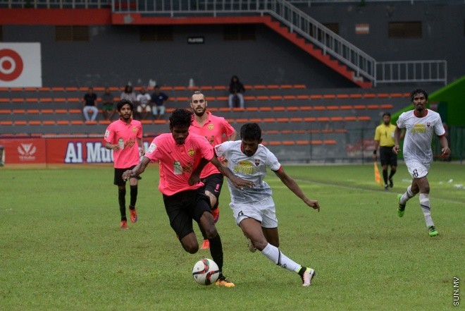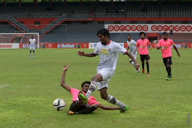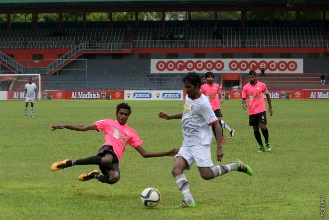 އުރީދޫ ދިވެހި ޕްރިމިއާ ލީގްގައި ޓީސީ ސްޕޯޓްސް ކުލަބް އާއި ޔުނައިޓެޑް ވިކްޓްރީ ކުޅުނު މެޗުގެ ތެރެއިން--- ސަން ފޮޓޯ: މުހަންމަދު އަފްރާހް