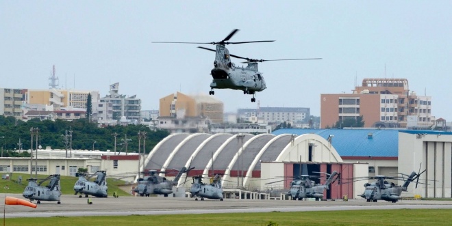 އޮކިނަވާގައި ވާ އެމެރިކާގެ އަސްކަރީ ބޭހަށް ހެލިކޮޕްޓަރެއް ތިރިކުރަނީ