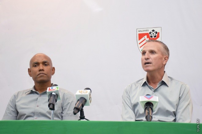 ގައުމީ ފުޓްބޯޅަ ޓީމްގެ ކޯޗު ސްޓެވާޓް މިއަދު ނޫސްވެރިންނާ ބައްދަލުކޮށް ވާހަކަ ދައްކަނީ --- ސަން ފޮޓޯ: ފަޔާޒް މޫސާ