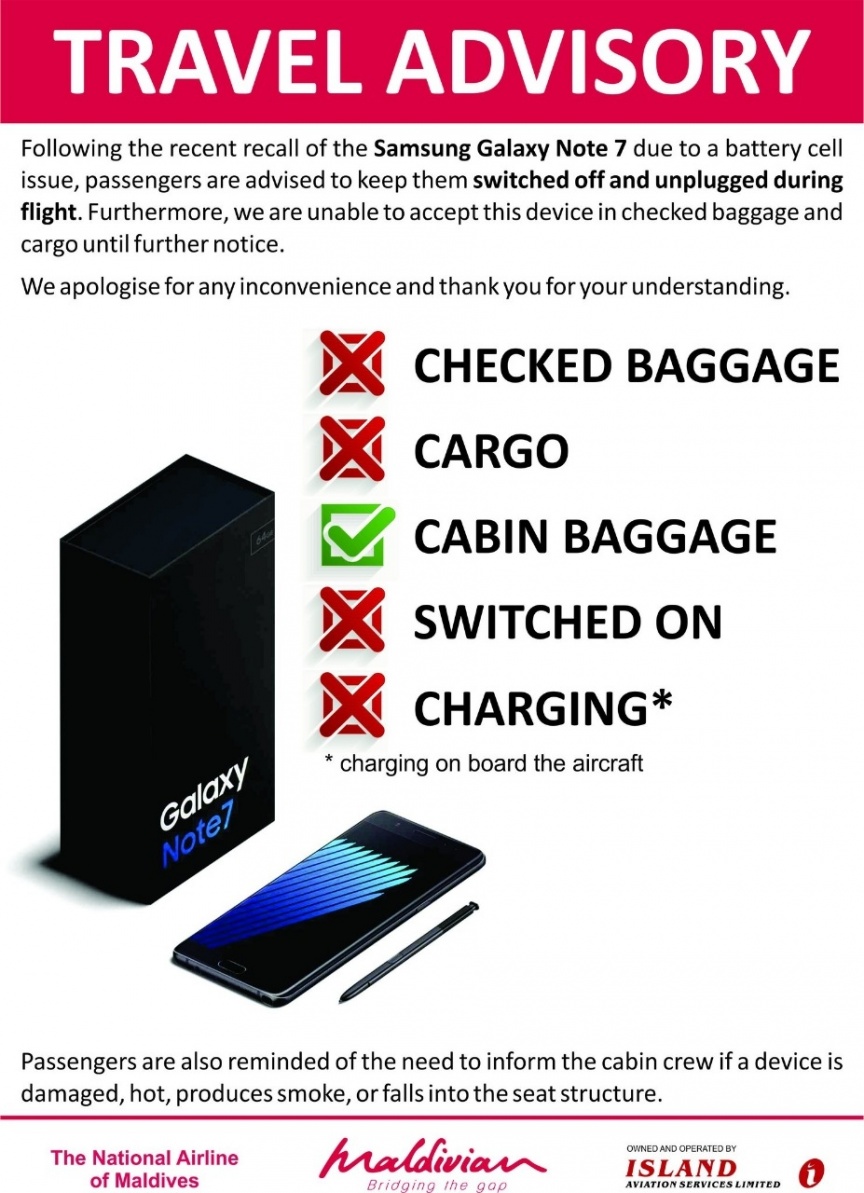 މޯލްޑިވިއަންގެ ހެޑް އޮފް އެޑްމިނިސްޓްރޭޝަން އަލީ ނަޝާތު ހަމީދު "ސަން" އަށް ވިދާޅުވީ، ސެމްސަންގް ގެލެކްސީ ނޯޓު 7 މޯލްޑިވިއަންގެ ފްލައިޓުތަކަށް ވެސް އެރުވޭނީ ފޯނު ނިއްވާލުމަށް ފަހު، ކެބިން ބެގޭޖު ނުވަތަ ހޭންޑް ލަގެޖާ އެކުގައި އެކަނި ކަމަށެވެ.