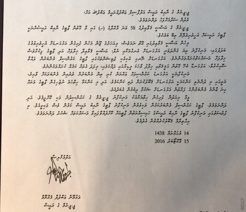 "އަޅުގަނޑަށް ނޭނގި އެކިއެކި ޕެޓިޝަންތަކުގައި ޕާޓީގެ ކައުންސިލްގެ މެމްބަރުން ލައްވައި ސޮއި ކުރުވައި އަޅުގަނޑާ ބެހޭ ގޮތުން ހަގީގަތާ ހިލާފު ވާހަކަ މީޑިއާގައި ދައްކަވައި، މިފަދަ އެތައް ކަމެއް ކުރައްވަމުންނެވެ. މަނިކުފާނަކީ އަޅުގަނޑު ކައުންސިލަށް އައްޔަން ކުރި ތިން މެމްބަރުންގެ ތެރެއިން މެމްބަރަކަށްވާއިރު، މަތީގައި މި ދެންނެވި ކަންކަމަކީ އަޅުގަނޑަށް ގަބޫލު ކުރަން ދަތި ކަންކަމެވެ. އަދި މިކަންކަމާ ހިތްހަމަނުޖެހިގެން ޕާޓީގެ ވަރަށް ގިނަ އާންމު މެމްބަރުންގެ ފަރާތުން އަޅުގަނޑަށް ޝަކުވާ ލިބެމުންދެ އެވެ،" މައުމޫން ފޮނުއްވެވި ސިޓީގައިވެ އެވެ.