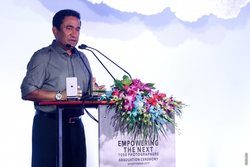 24 ސެޕްޓެމްބަރު 2017: 1،000 ފޮޓޯގްރާޕަރުން ދަސްވެނިމުން ފާހަގަކުރުމަށް ދަރުބާރުގޭގެއި ރޭ ބޭއްވި ރަސްމިޔާތުގައި ރައީސް ޔާމިން ވާހަކަދައްކަވަނީ---ސަން ފޮޓޯ/ މުހައްމަދު އަފްރާހް--