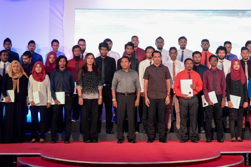 24 ސެޕްޓެމްބަރު 2017: 1،000 ފޮޓޯގްރާޕަރުން ދަސްވެނިމުން ފާހަގަކުރުމަށް ދަރުބާރުގޭގެއި ރޭ ބޭއްވި ރަސްމިޔާތުގައި ކޯސް ފުރިހަމަކުރި ޒުވާނުންނާއެކު ގްރޫޕް ފޮޓޯއަކަށް ހުއްޓިގެން---ސަން ފޮޓޯ/ މުހައްމަދު އަފްރާހް---