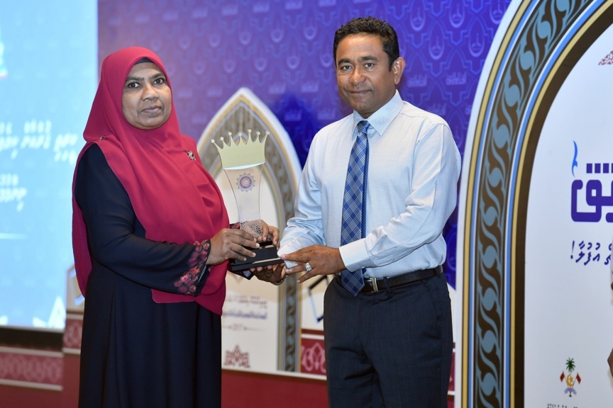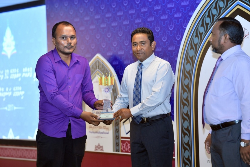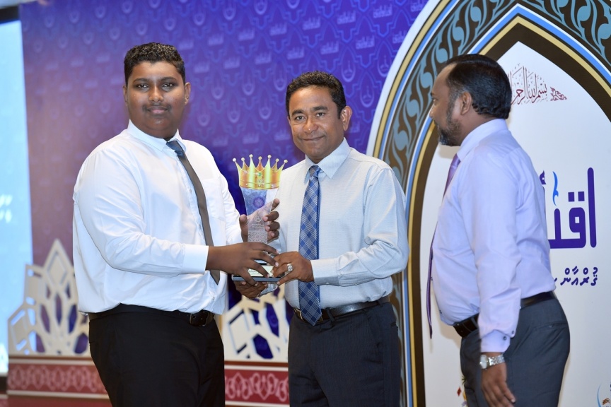 ޤުރުއާން ކިޔެވުމުގެ ގައުމީ މުބާރާތުގެ ނިމުމުގެ ރަސްމިއްޔާތުގައި ހާފިޒުކަމުގެ ޝަރަފް ލިބުނު ނަބީހަށް ރައީސް އެވޯޑް ހަވާލު ކޮށްދެއްވަނީ --- ފޮޓޯ/ ރައީސް އޮފީސް