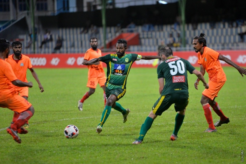 އުރީދޫ ދިވެހި ޕްރިމިއާ ލީގުގައި މާޒިޔާއާއި ގްރީން ބައްދަލުކުރި މެޗުގެ ތެރެއިން: މިރޭ މާޒިޔާ އާއި ޓީސީ ނުކުންނަ އިރު، ދެ ޓީމު އޮތީ ޕޮއިންޓްގެ ގޮތުން އެއްވަރުވެފައި --- ސަން ފޮޓޯ/ މުހައްމަދު އަފްރާހް